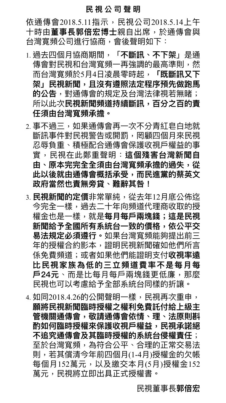 民視被TBC(台灣寬頻通訊)下架事件爭議多日,民視發表聲明表明不追究TBC系統播出民視新聞台之著作權責任,並表示持續供訊,直呼單方面斷訊應由台灣寬頻承擔,「民視新聞頻道持續斷訊,百分之百的責任須由台灣寬頻承擔」。