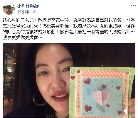 〔娛樂頻道/綜合報導〕女星「小S」徐熙娣與老公Mike結婚13年,育有三個女兒,小S和孩子們宛如朋友般的相處讓許多人羨慕,她在母親節時公開女兒親手做的卡片,其中二女兒的卡片讓她飆淚,也道出二女兒一直被夾在中間的心酸。