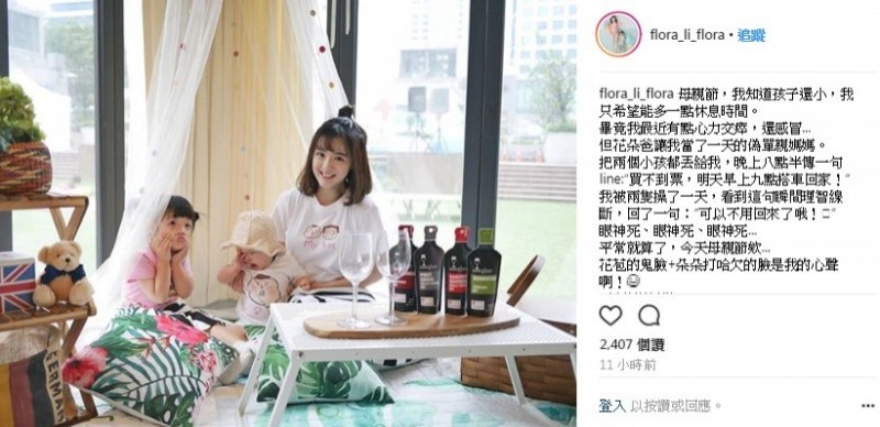 花花平時帶孩子相當辛苦,加上近來有些心力交瘁及感冒,本希望在母親節這天能好好放鬆,沒想到竟當了一天「偽單親媽媽」。