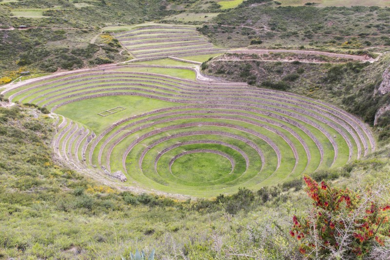海拔約3500公尺的莫雷梯田,真正的用途未知,根據學者推測,可能是印加帝國的「農業改良場」,莫雷梯田闢建時依風向和陽光照射角度設計,從最底層到最上一層,每層溫差攝氏0.5度,最大的梯田落差不過30公尺,卻有攝氏15度溫差,宛如在自然的環境下做成的溫室,且封閉式漏斗狀梯田像碗一樣,在雨水豐富的安地斯山區竟然不會積水,排水工程顯然非常精良。