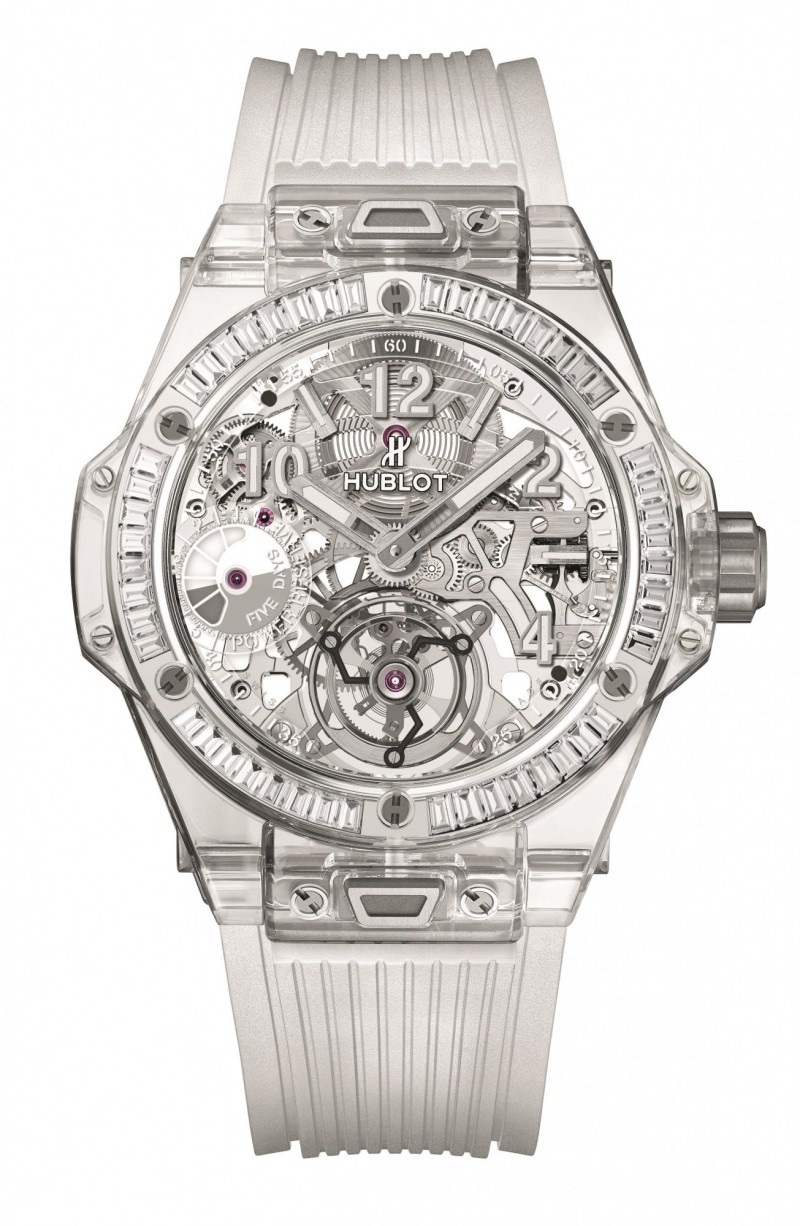 試戴價格將近590萬元的宇舶Big Bang藍寶石陀飛輪鑲鑽腕錶,笑說老公應該會羨慕她戴著這麼厲害的錶。