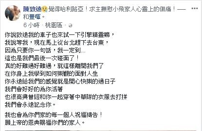 陳致遠在臉書難過表示,豐偌暉永遠都會想要幫助身邊的人。今再度哀悼快「以前當我失落時,他很豪邁的說挺我開店,這句話永遠烙印在我心中,我們會好好的為你活著,也很高興曾經和你一起穿著中華隊的衣服去打拼,我們會永遠記(紀)念你。」