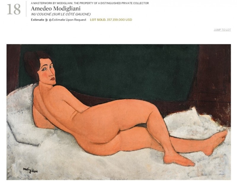 前一幅1.7億的《裸女》,目前為拍賣史上第3高價作品。第1與第2高價,分別為達文西作品《救世主》(Salvator Mundi)4.5億美元;畢卡索作品《阿爾及爾的女人(O版)》(Les Femmes d'Alger, Version O)1.79億美元。