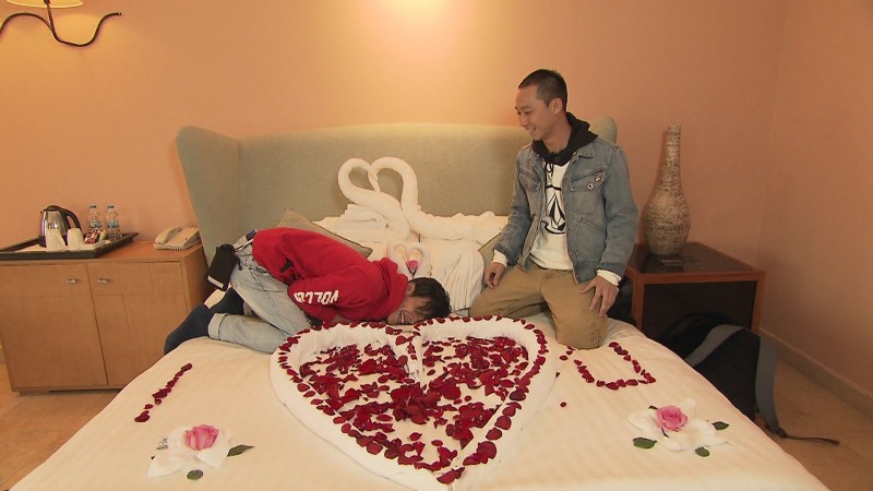 〔記者洪素津/台北報導〕浩子在環遊世界一年後,日前回歸TVBS《食尚玩家》與阿翔合體前往蜜月勝地約旦,來場「小別勝新婚」之旅,製作單位為此精心安排一間浪漫的蜜月套房,房間映入眼簾的是舖滿花瓣愛心的大床,牆上還掛上兩人合成的甜蜜婚紗照,浩子感染氣息下十指緊扣阿翔,阿翔也浩子說「我想你」,只見兩人嬌羞看著對方,氣氛曖昧。浩子更坦言來到蜜月套房,真的有「愛苗在滋長」,旁人也笑稱兩人有「化學變化」。