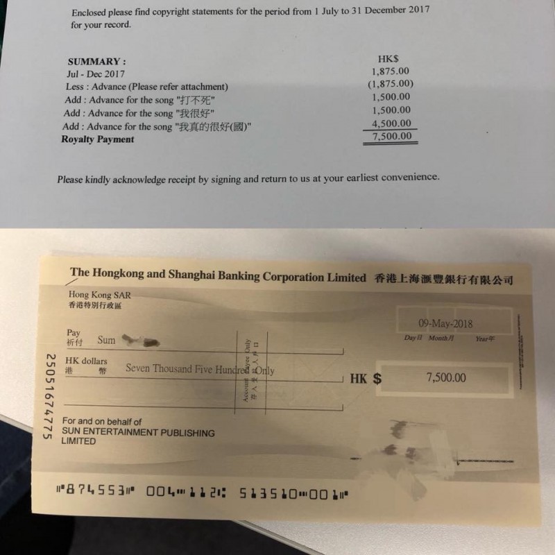 沈震軒去年推出3首單曲,其中包括2首粵語歌及1首國語歌,16日在臉書曬出支票,「第一次收到一張來自我創作的歌曲《打不死》《我很好》和《我真的很好》的支票。」3首單曲創作費,僅獲得7,500港幣(約台幣29,300元)。