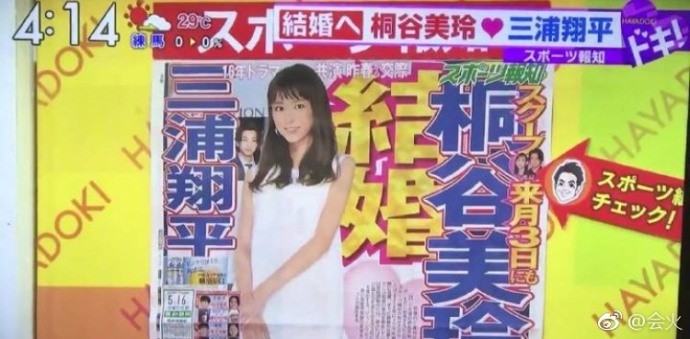 據日本《報知體育報》報導,三浦翔平和桐谷美玲幾天前已向雙方親人、經紀公司公開結婚決定,目前暫定6月3日三浦翔平30歲生日當天,小倆口就會登記結婚,此消息在日本娛樂圈傳為佳話。