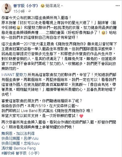 昨(16)晚小宇在自己的臉書之上發佈一則貼文,她說:原本抱著「終於可以走走看電視上傳說中的星光大道了!」,而且還在自己腦海裡彩排著跟星勢力夥伴一起挑選漂亮的衣服,甚至還努力健身想用最美姿態總進金曲獎頒獎典禮,沒想到卻隨著入圍名單公布而落空。