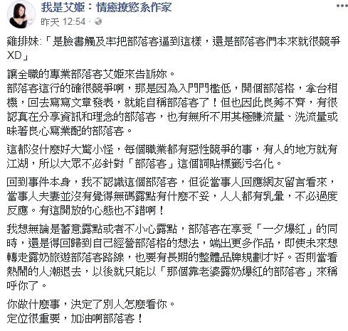 艾姬表示部落客入門門檻低,因此的確相當競爭,且資質良莠不齊,總有無所不用其極賺流量、洗流量或昧著良心寫業配的部落客,但艾姬指出每個職業都有惡性競爭的事,不必對部落客汙名化。事件中的部落客夫妻對於露點並沒有太大的反應,艾姬也說:「當事人夫妻並沒有覺得無碼露點有什麼不妥,人人都有乳暈,不必過度反應。有這開放的心態也不錯啊!」