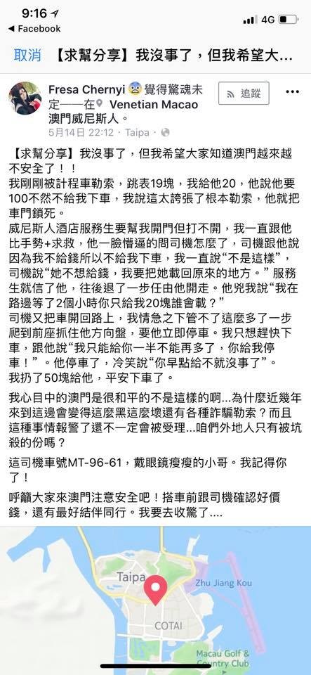 陳柔安說,澳門小黃司機的行徑如當地惡霸,見外地人就宰,最誇張的,他們根本沒在怕。前天陳柔安看澳門新聞,感受更深,「受害人是台灣女遊客,下車前被司機漫天喊了5倍車資,女遊客不從,還被反鎖在車上威脅。」