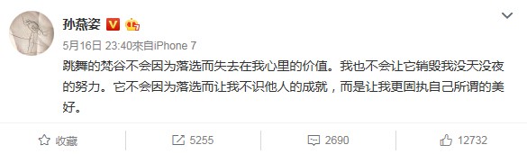 孫燕姿深夜在微博一派輕鬆說:「跳舞的梵谷不會因為落選而失去在我心裡的價值,我也不會讓它銷毀我沒天沒夜的努力;它不會因為落選而讓我不識他人的成就,而是讓我更固執自己所謂的美好。」