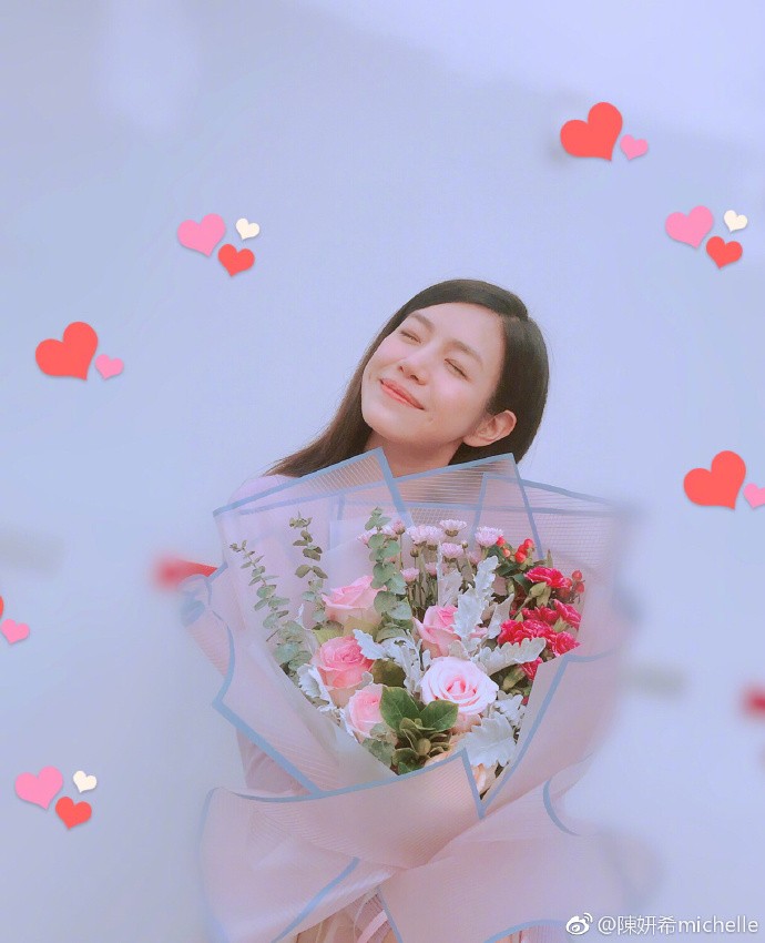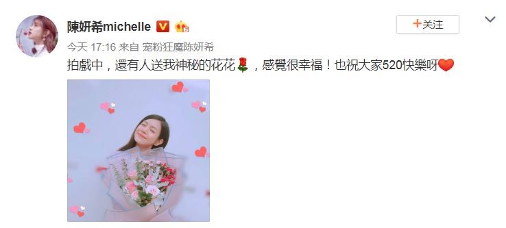〔娛樂頻道/綜合報導〕今天是5月20日(諧音我愛你),許多藝人會發文祝福大家520快樂,而陳妍希今日傍晚則是在微博發出一張自己抱著一大把鮮花的照片,發文:「拍戲中,還有人送我神秘的花花,感覺很幸福!也祝大家520快樂呀。」雖然沒在文裡面特別寫出是誰送的,不過粉絲也在留言表示,不用猜了一定是老公送的,讓人看了幸福滿滿。