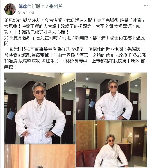 傅達仁從去年11月起飛瑞士尋求安樂善終,不過後來卻前後延期5次,之後剛好遇到兒子決定結婚,經歷過兒子結婚後,傅達仁改變了人生觀,在臉書上不想死的原因首曝光,認如今病痛纏身,不管死在何時?何地?都無憾、都平安,表示自己將隱居世外桃源和胰癌奮戰,透露自己會做各式溫和治療,來減輕症狀,增加生命,且望一路延長賽中、上帝都站在我這邊,勝敗 都無憾。