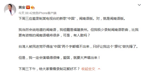 黃安斬釘截鐵說:「對,就是閩南語版。」他說,自己當然會說道地閩南語,「我祖籍是福建泉州,但極少錄製閩南語歌曲」,黃安認為,比他更有資格的閩南語唱將很多,「可是,有人敢嗎?」他高呼將用閩南語唱歌,很顯然地,這位「台獨剋星」還是樂當正港台灣人。
