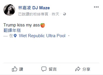 薔薔這幾天人在美國賭城拉斯維加斯享受假期,昨她身在美高梅酒店泳池畔(Wet Republic Ultra Pool,MGM),和友人一起狂歡。薔薔上傳一張養眼辣照,她身穿一雙白色高跟鞋,側身秀出比基尼金色泳衣,還不吝狂露丁字褲襯托的唯美翹臀,特別的是,薔薔還大膽留言:「Trump kiss my ass。」(川普吻我屁股)言論和她美臀一樣有夠火辣。