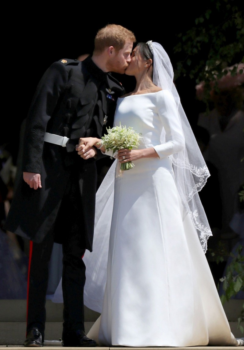 美國女星梅根馬克爾(右)穿Givenchy訂製婚紗嫁給英國哈利王子。(Givenchy提供)
