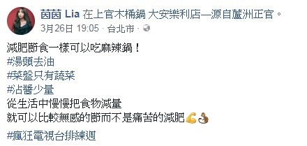 茵茵在臉書表示「減肥節食一樣可以吃麻辣鍋」,提到要將湯頭去油,菜盤中只能有菜不能有其它加工食品,至於提味用的沾醬也只能少量攝取,茵茵強調:「從生活中慢慢把食物減量,就可以比較無感的節(食)而不是痛苦的減肥。」