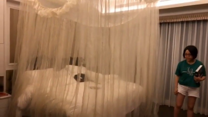 擅於理財的于美人砸2.5億買下位於中山區的90坪豪宅,在直播中掌鏡的友人直搗閨房,只見于美人坐在純白的大床上看書,整個人被大蚊帳罩住,讓友人傻眼問「妳以為妳是公主喔」,她的房間走簡約風格,蚊帳置身其中的確有些格格不入,粉絲們笑說「當兵時的產物」、「居然有這麼大的蚊帳」,于美人反駁這能防夏天惱人的蚊子,並強調這是法國的「頂級紗帳」,清理起來相當方便。