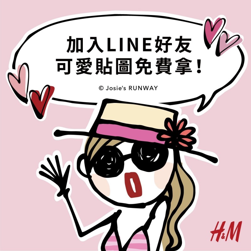 「H&M X Josie 時尚日常」LINE貼圖免費下載期間自2018年5月22日起至2018年6月20日止,貼圖使用期限為 90天 。同時於2018年5月22日至2018年6月3日期間於全台實體門市更推出H&M LINE好友加碼折扣, 凡加入H&M LINE好友即可獲得LINE優惠券(LINE COUPON),可即刻享有H&M LINE好友紅標折扣商品(實際商品貨量及款式依門市為主)再8折優惠,此優惠單筆消費不限件數,每個帳號限用一次。