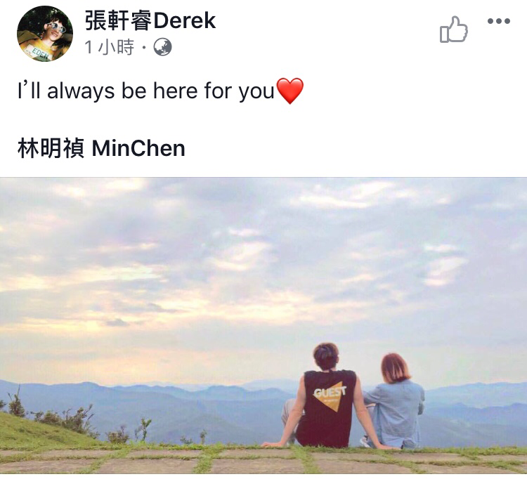 〔記者王心妤/台北報導〕男星張軒睿20日被拍到與「大馬甜心」林明禎私下出遊,遭疑是否戀愛中。隔了2天,張軒睿卻突然在臉書貼出與林明禎的背影合照,寫下:「l’ll always be here for you」有些大方認愛的意味。