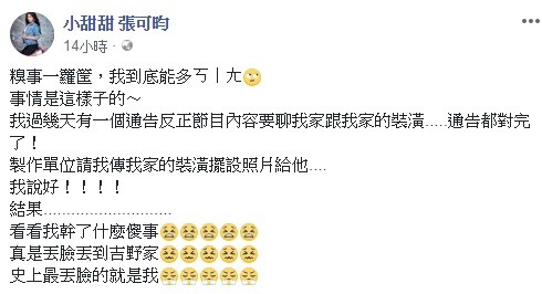 小甜甜透露有一個通告要聊關於室內裝潢的話題,她便將家中的裝潢擺設照片傳給製作單位,但她卻錯將李昇基的照片傳了出去,其中還包含的李昇基半躺在床上對鏡頭放電的照片,發現錯誤後她趕緊解釋「是我愛人真的很抱歉,我自己也嚇傻了」,工作人員更是笑翻,虧她「這是你家裝潢嗎」,讓小甜甜忍不住在臉書大喊「史上最丟臉就是我」,粉絲們也笑回「用這裝潢妳心臟受得了嗎,每天回家會不會都睡不著」。