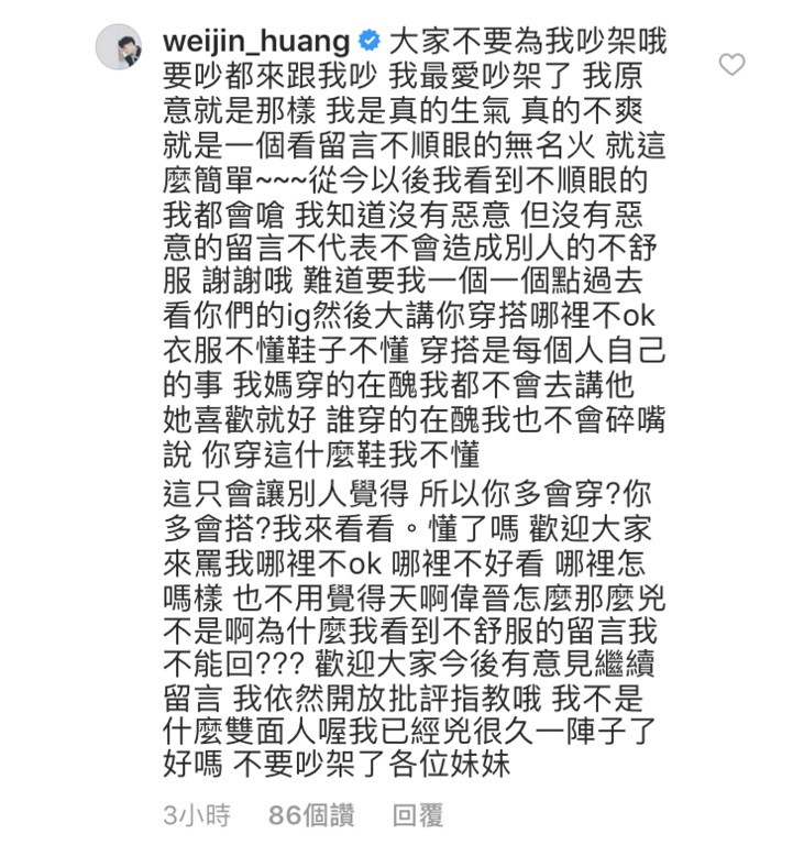 對此,他昨日也再度留言回應「我是真的生氣,就是一個看留言不順眼的無名火,從今以後我看到不順眼的我都會嗆,我知道沒有惡意,但沒有惡意的留言,不代表不會造成別人的不舒服。 」