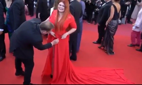 身材有些豐腴的Yulia Rybakova身穿長版紅色禮服走紅毯,裙擺長到拖地,她本來站著拍照,要走動時裙擺卻被後方男子踩住,整件裙子直接脫落,大紅色內褲全見客,旁人都看傻了眼。只見她有些浮誇的回頭望,接著開始大笑,闖禍的男子也連忙幫她將裙子扣回去,事後Yulia Rybakova將整個經過PO上IG,卻被懷疑是事先串通,不僅因她的反應太假,男子熟練的舉動也啟人疑竇,痛批她想紅想瘋了。