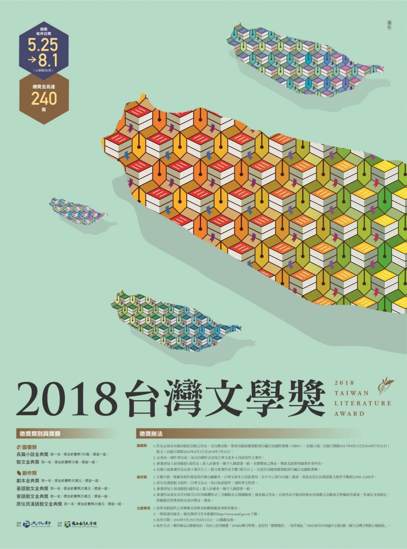 〔記者凌美雪/台北報導〕由國立臺灣文學館舉辦的「台灣文學獎」,2018年徵獎辦法出爐,圖書類分長篇小說、散文2個獎項;創作類有劇本、台語散文、客語散文及原住民漢語散文4個獎項。兩類共6項,總獎金240萬元,圖書類散文獎金提高至50萬元。活動收件自5月25日至8月1日。