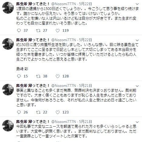 麻生希熬過150天的羈押期,在推特向支持自己的粉絲表達歉意,認為她因個人行為佔用社會資源,雖然目前判決尚未出爐,但不論結果為何她都會虛心接受,並說在看守所的這些日子裡思考了很多事,也將這些心路歷程寫成日記,希望有朝一日能出版,讓外界了解她的心情。最後麻生希也說現在有許多人不喜歡她,但她還是很喜歡自己,若有機會投胎轉世她還是想要做自己,雖然大難臨頭,她仍表現出自信滿滿的模樣,引起網友熱烈討論。