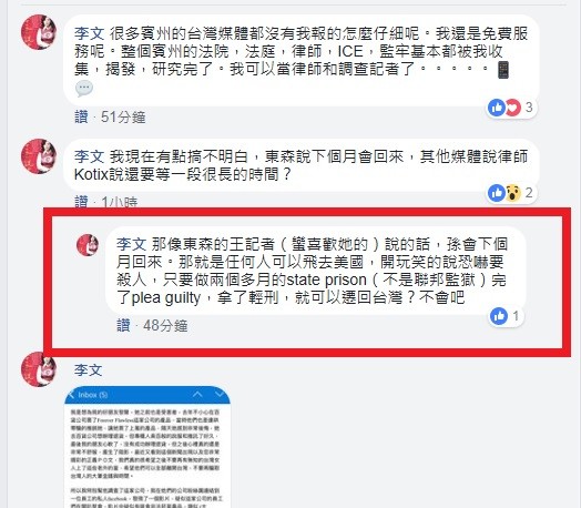 對於孫安佐最快1個月後就能回到台灣,李文持不同看法,她直接打槍東森報導,「照這樣說,那就是任何人可以飛去美國,開玩笑的說恐嚇要殺人,只要做兩個多月的州監獄然後認罪,藉此拿了輕刑,就可以回台灣」,李文驚訝說了一句「不會吧!」認為孫安佐應該不可能這麼快返台。