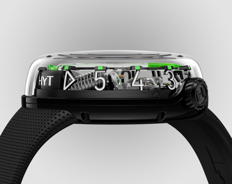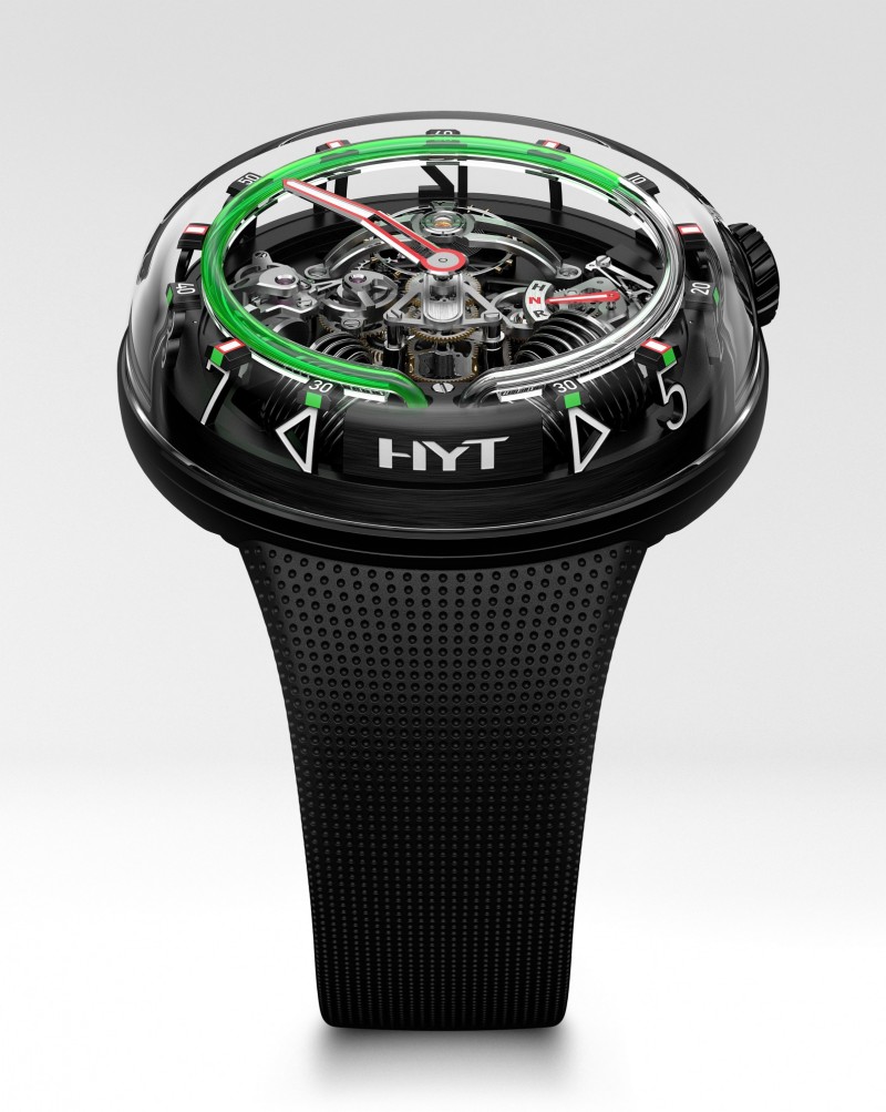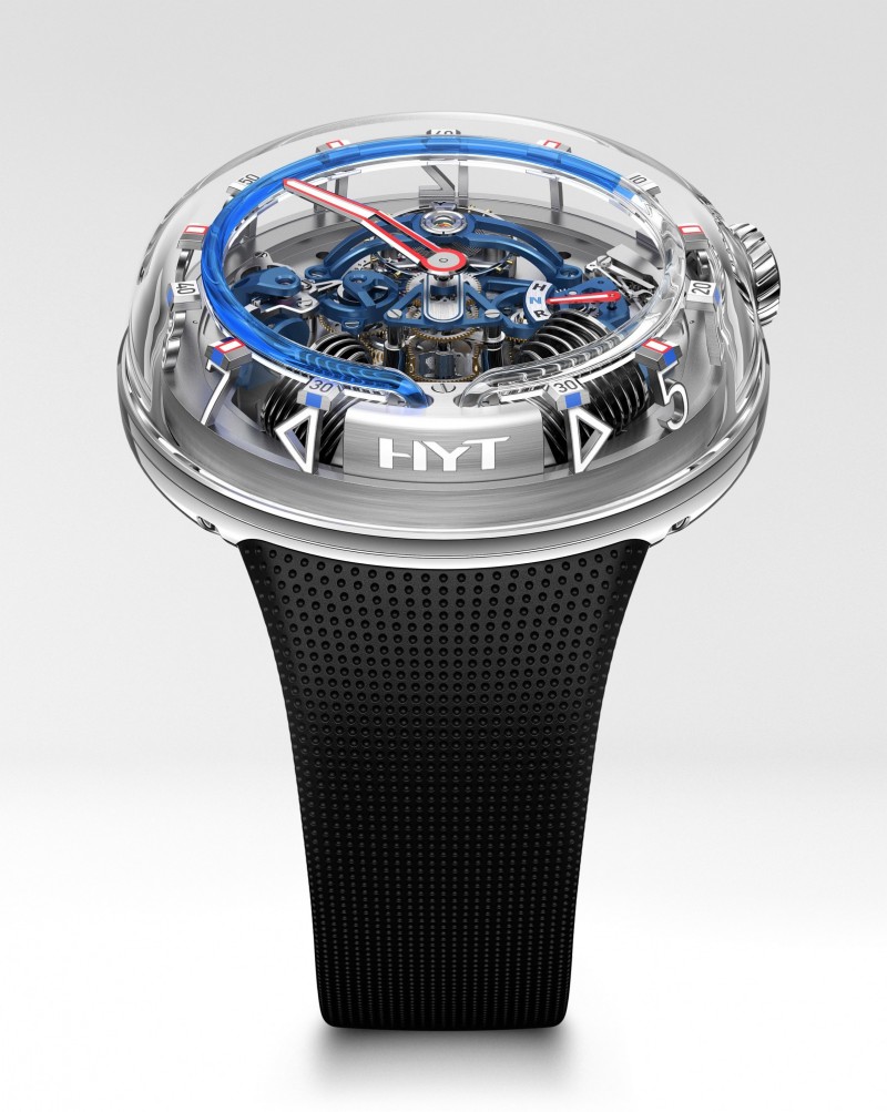 此外,「H20」錶款可見的有色液體在導管內不斷移動;一款披上黑色外衣並懷抱亮綠色液體;另外一款則以銀色錶殼搭配深藍色液體。兩款述說共同的設計語言:透明,同時展現深層的美學與技術細節。兩個版本的H20,每款限量僅25只。「時間像不斷奔流的河水從不止息」,此技術即反映了這樣的核心理念。