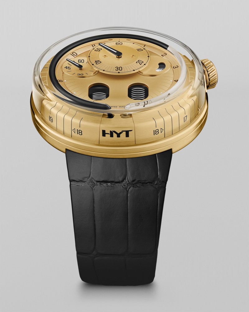 〔記者方惠宗/台北報導〕獨立製錶品牌HYT透過獨家專利微型液體模組驅動時間前進,帶來以水報時的絕妙美學。最新一款名為「H0 Gold」的錶款頌揚黃金、述說這項貴金屬從古董珠寶如何在數位時代裡化身報時之師。黃金的純粹烘托黑色液體代表方才走過的時間,透明液體則象徵眼前的未來,帶著水滴圖案的動力儲存顯示在這個以360度呈現時間與空間錯縱複雜關係的錶盤上,畫下點睛之筆。