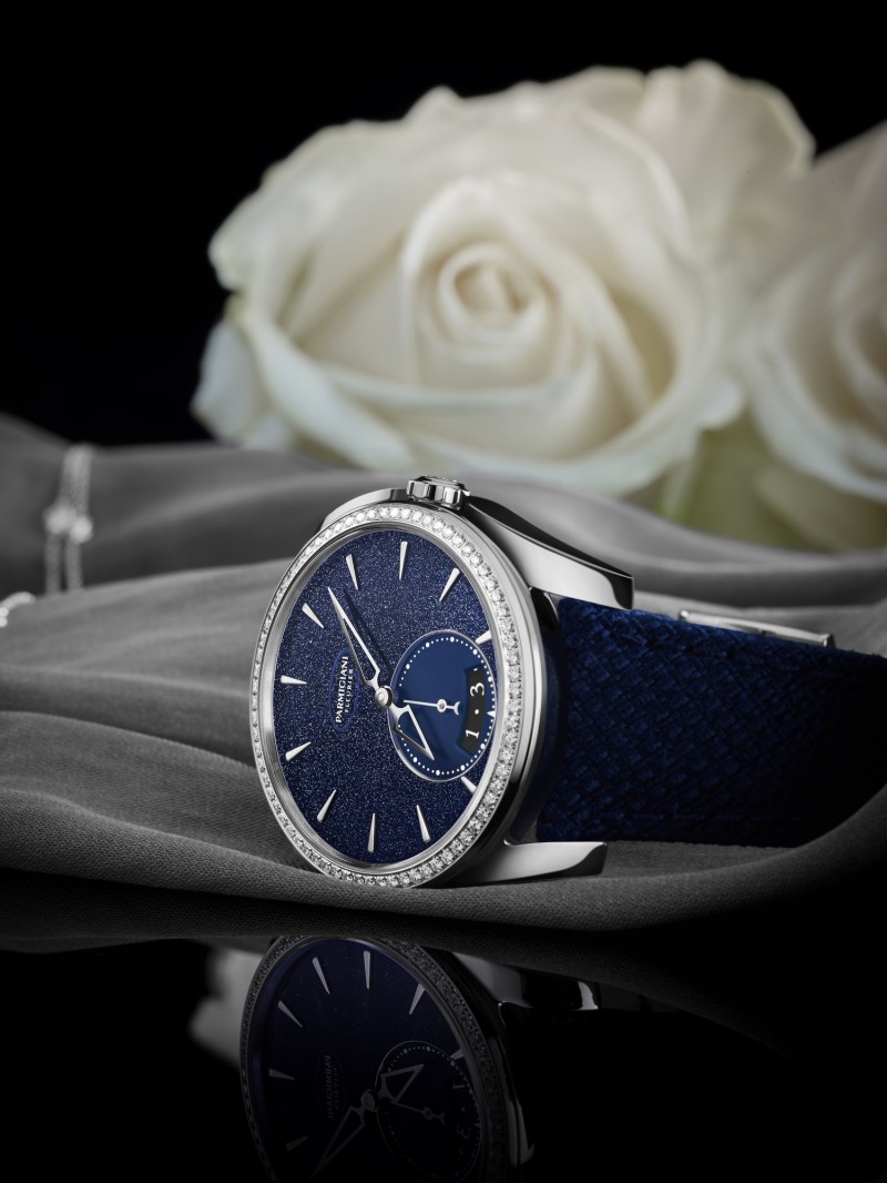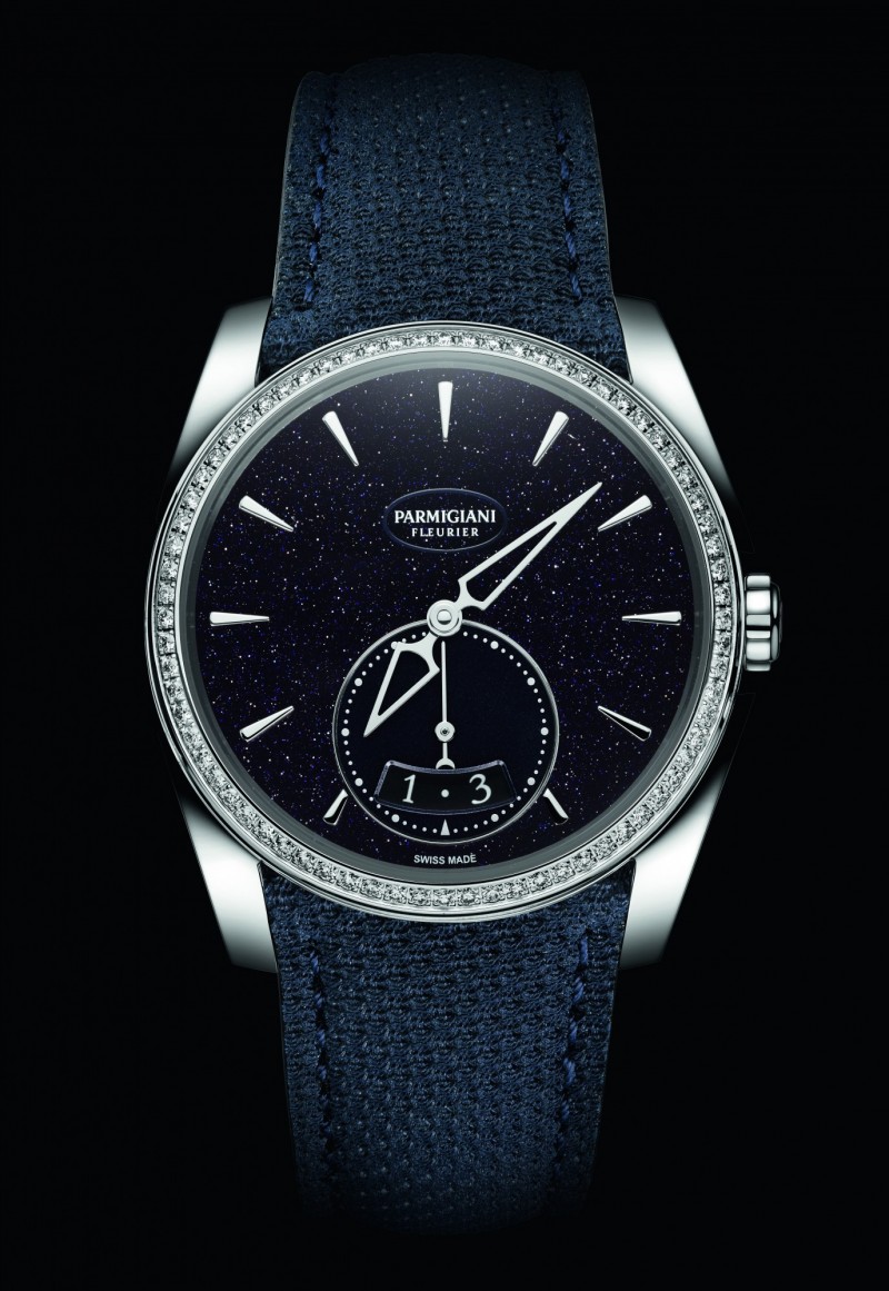 砂金石獨特的紋理外觀令午夜藍砂金石錶盤猶如夜空中閃耀的星星,令人沉醉。指針以鏤空設計,更顯錶盤空靈深邃之美。精鋼錶圈鑲72顆圓形切割鑽石,總共約0.51克拉,將錶盤星芒延伸至整個錶殼。6點鐘位置,小秒針在午夜藍背景上脫穎而出,還設有相匹配的漸變深色日期顯示盤。