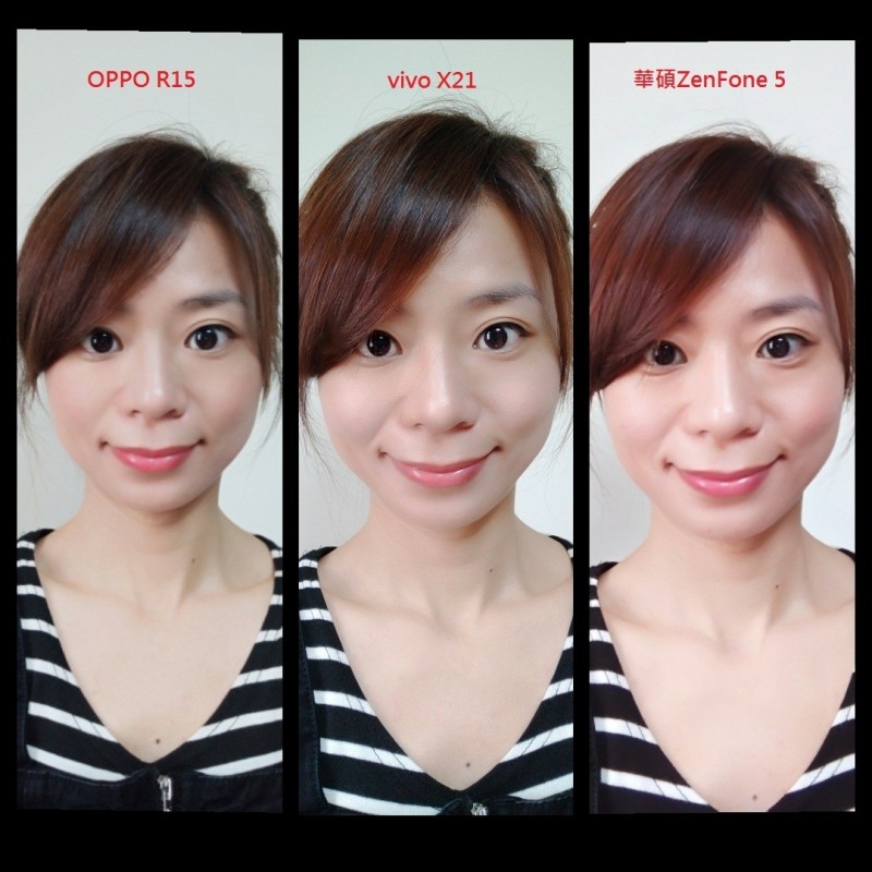 對不少女性來說,手機自拍功能很重要,實測自動智慧美顏,OPPO R15和vivo X21的效果都不錯,OPPO R15的優點是能呈現妝感,vivo X21膚色偏白晰,喜好見仁見智。華碩ZenFone 5則是在自然度再加強一點會更好。