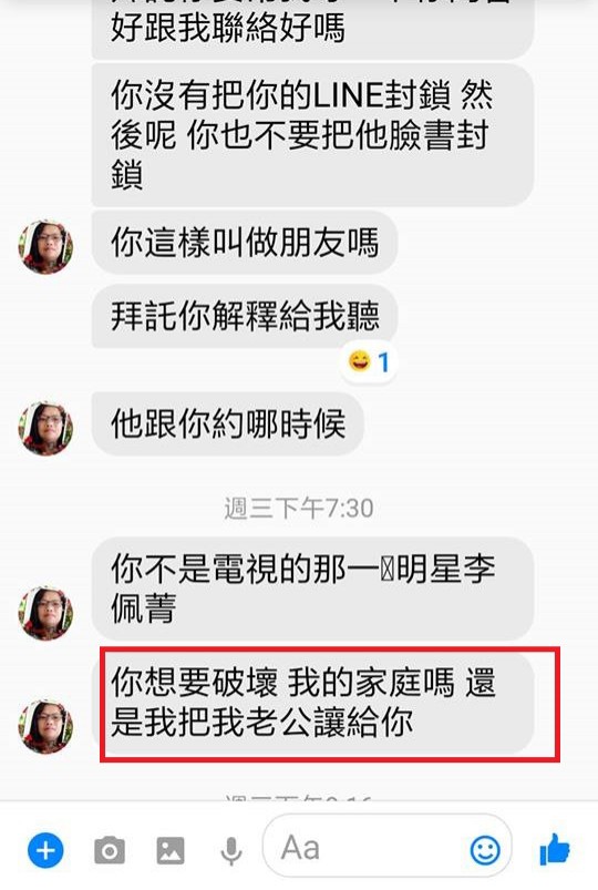 一早6點多,李珮菁公開她和某女網友對話,對方指責李珮菁「你這樣叫做朋友」、「拜託你解釋給我聽」,還問她:「你不是電視的那一明星李珮菁?」最後更撂狠話:「你想要破壞我的家庭嗎?還是我把我老公讓給你?」