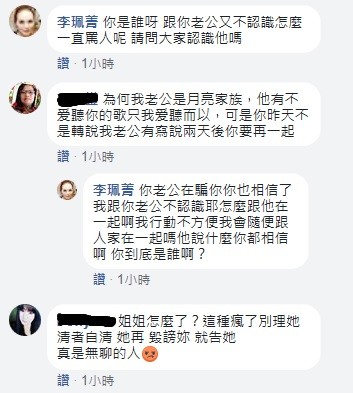 稍早,李珮菁再度發文,留言:「奇怪,最近Facebook為什麼隨便就讓人家進來, 讓我莫名其妙?一個女人說我搶他的丈夫, 我真快要笑掉大牙,我都忙得不得了還有時間戀愛嗎?妳有病,去看醫生,我跟你老公也不認識,跟他約會?莫名其妙!」