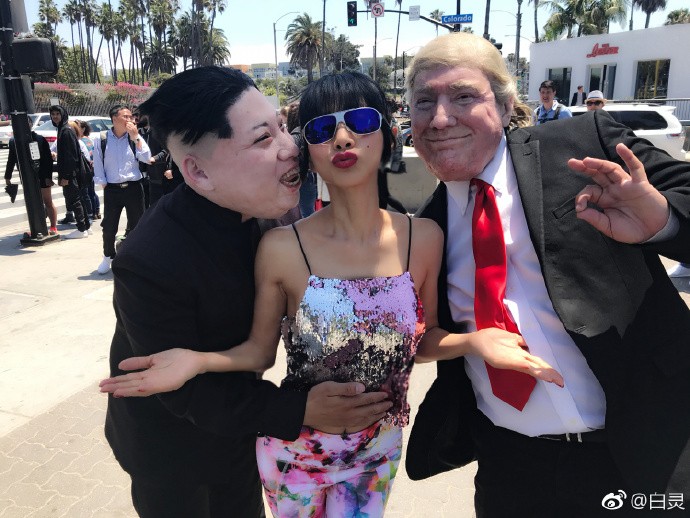 台北時間一早6點半左右,人在美國的白靈,透過微博曝光和川普、金正恩合照,原來2人是人型布偶裝扮的,乍看之下,還真得讓人以為川普和金正恩見面了。白靈還故意留言說:「朋友帶我到海邊餐館午餐,意外偶遇美國總統川普和北朝鮮領導人金正恩。」