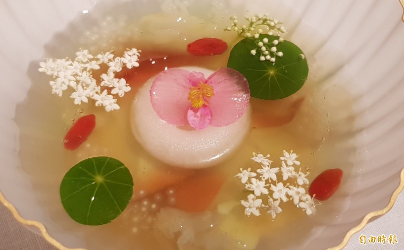 平塚牧人有一道招牌甜點〈Nympheas〉,靈感源於莫內的作品〈睡蓮〉,食材來源多在台灣在地取材,包括台灣甜豆花(豆腐花)為底,搭配金蓮花、金蓮花葉、秋葵、枸杞、蓮子,澆上糖水而成,兼具視覺與口感,令人相當驚艷。但深黯法國文化的文化部次長楊子葆卻覺得,這道甜點構圖既美,色彩也繽紛討喜,花葉翻飛,波光瀲豔,荷花「濯清漣而不妖」,口感豐富而有深度,與其說是莫內〈睡蓮〉,不如說更像台灣前輩畫家林玉山的膠彩畫〈蓮池〉。