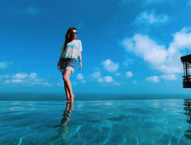 Selina近日和家人一起出國旅遊,一家人打扮得超浮誇,Selina甚至露出側乳和黑Bra,讓粉絲們驚豔不已。26日她再PO出多張度假美照,只見她穿上比基尼,多套上一件白色罩衫,在無邊際泳池展現出若隱若現的性感。不過更吸引人注意的,是她整個人明顯激瘦了一圈,身形和輪廓越來越明顯,讓大批粉絲大讚女神超正。