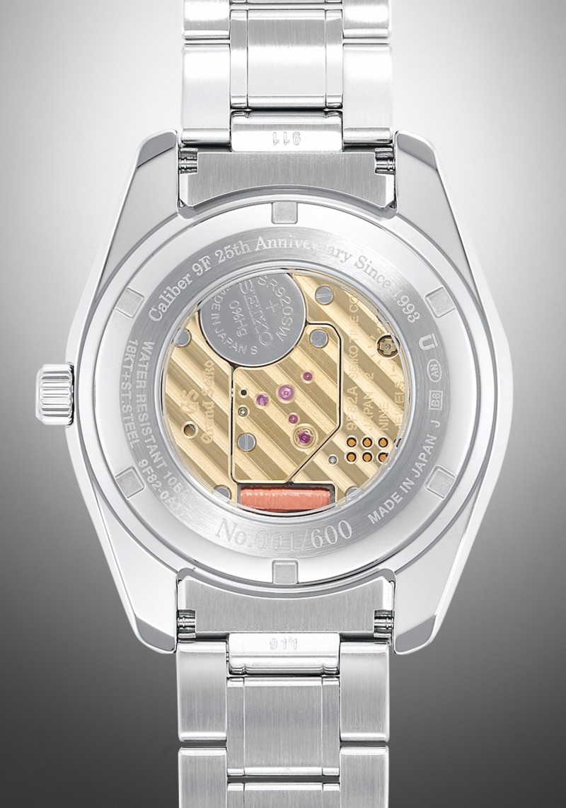 同時,Grand Seiko兩款「9F」紀念限量錶款在外型設計上各具特色,SBGT241復刻初代1993年款的柔和外型及鏈結細緻的錶帶,為細部帶來更輕爽的印象;放大的錶徑在佩戴時呈現視覺平衡的存在感。另一款SBGV238則承襲1967年44GS的「Seiko Style」設計理念,以18K黃金錶圈和香檳金面盤相互呼應,利用與紀念款式相稱的華麗配色,創造出鮮明的配戴印象,而且底蓋採用透明樣式,將精美打磨的機芯呈現眼前,並刻有「Caliber 9F 25th Anniversary Since 1993」的字樣及限量編號。