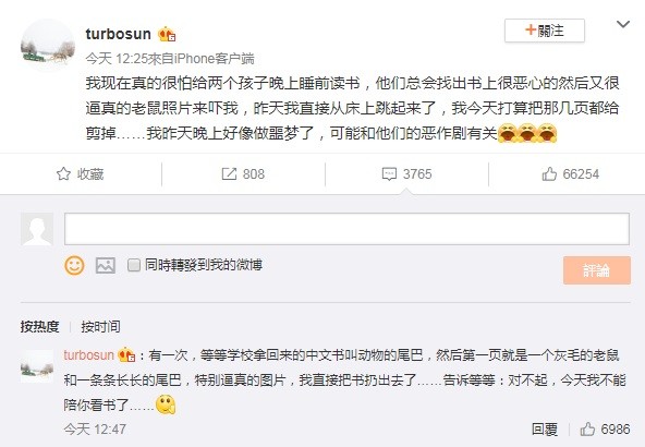 孫麗平時習慣說睡前故事給孩子聽,但現在她卻對這件事充滿恐懼,原來是兄妹倆會在書上找很逼真又噁心的老鼠照來嚇她,昨天她嚇到從床上跳起,晚上還做了噩夢,她懷疑與小孩的惡作劇有關,無奈的說:「我今天打算把那幾頁都給剪掉.....」更表示有一次她看到書上的老鼠,嚇得直接把書扔出去,還向兒子道歉「我今天不能陪你看書了」,讓粉絲笑說「當媽媽真的很不容易」、「這肯定是爸爸的主意」、「以後扔給爸爸講」。