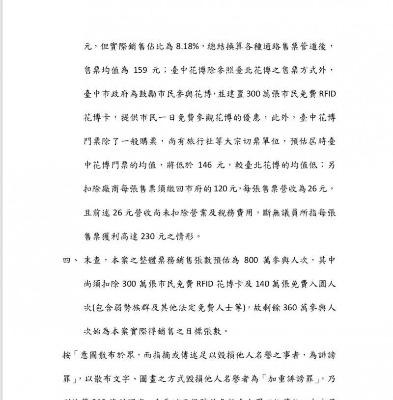 三立指一張票賺230元暴利是不實言論,「臺中市政府為鼓勵市民參與花博,並建置300萬張市民免費RFID花博卡,提供市民一日免費參觀花博的優惠,此外,臺中花博門票除了一般購票,尚有旅行社等大宗切票單位,預估屆時臺中花博門票的均值,將低於146元」。