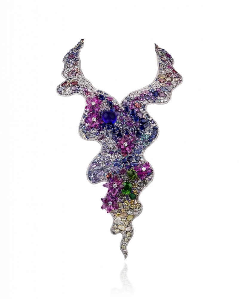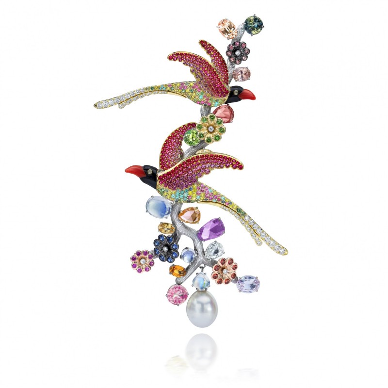 「紅喜鵲紅寶胸針」以清朝畫家郎世寧的作品「畫仙萼長春」為藍本,郎世寧以集結東西文化見稱,與Anna Hu以法式珠寶工藝表現華人文化有異曲同工之妙,Anna Hu特別取其畫作精髓,以18K白金為枝幹,鑲嵌多達5百多顆鑽石、黃鑽、紅寶石、藍寶石、月光石與彩色剛玉等,最終以一顆南洋珠點睛,展現出郎世寧畫作中以西洋色彩詮釋華人鳥語花香的意境。