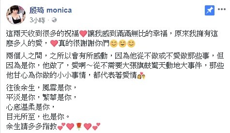 最後殷琦也向未婚夫告白「往後餘生,風雪是你,平淡是你,繁華是你,心底温柔是你,目光所至,也是你。餘生請多多指教」,粉絲們也紛紛留言向她賀喜,並祝福她要永遠幸福。