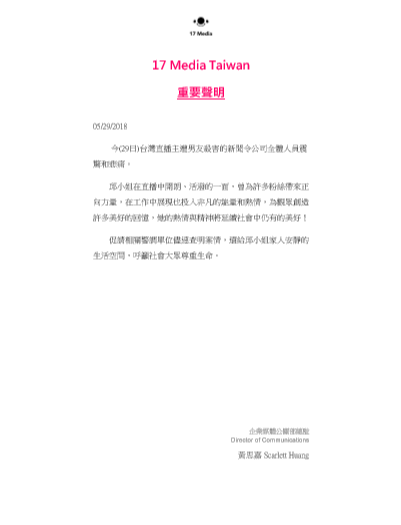 邱女是藝人黃立成「17直播」旗下直播主,午間17 Media對此發表聲明,「今台灣直播主遭男友殺害的新聞令公司全體人員震驚和悲痛。邱小姐在直播中開朗、活潑的一面,曾為許多粉絲帶來正向力量,在工作中展現也投入非凡的能量和熱情,為觀眾創造許多美好的回憶,她的熱情與精神將延續社會中仍有的美好!促請相關警調單位儘速查明案情,還給邱小姐家人安靜的生活空間,呼籲社會大眾尊重生命。」