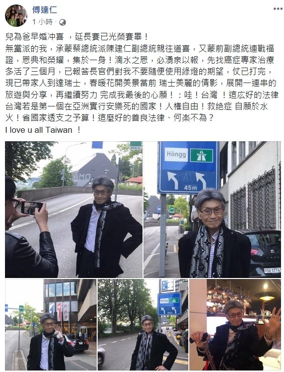 傅達仁去年11月在瑞士取得執行安樂死的資格,意味著隨時都可以執行,不過卻因故而暫緩。今年2月他為兒子舉辦婚禮「沖喜」,展開人生「延長賽」,接著找癌症專家治療。今天他在臉書寫下:「延長賽已光榮賽畢!」,並說:「多活了三個月,已報答長官們對我不要隨便使用綠燈的期望,仗已打完,現已帶家人到達瑞士,春暖花開美景當前,瑞士美麗的倩影,展開一連串的旅遊與分享,再繼續努力,完成我最後的心願!」