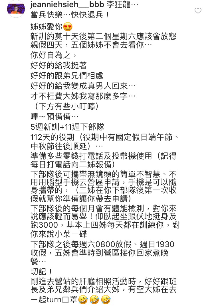 對於戲中的弟弟將國軍online,謝金燕霸氣給予打氣:「你好自為之,好好的給我挺著,好好的跟弟兄們相處,好好的給我變成真男人回來⋯」也貼心提醒他要記得帶零錢、智障型手機,告知收假時間及體能訓練內容等,展現大姊風範,而蔡凡熙也回應:「是的收到,我會打電話報平安的」。