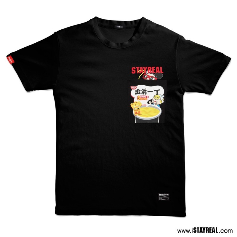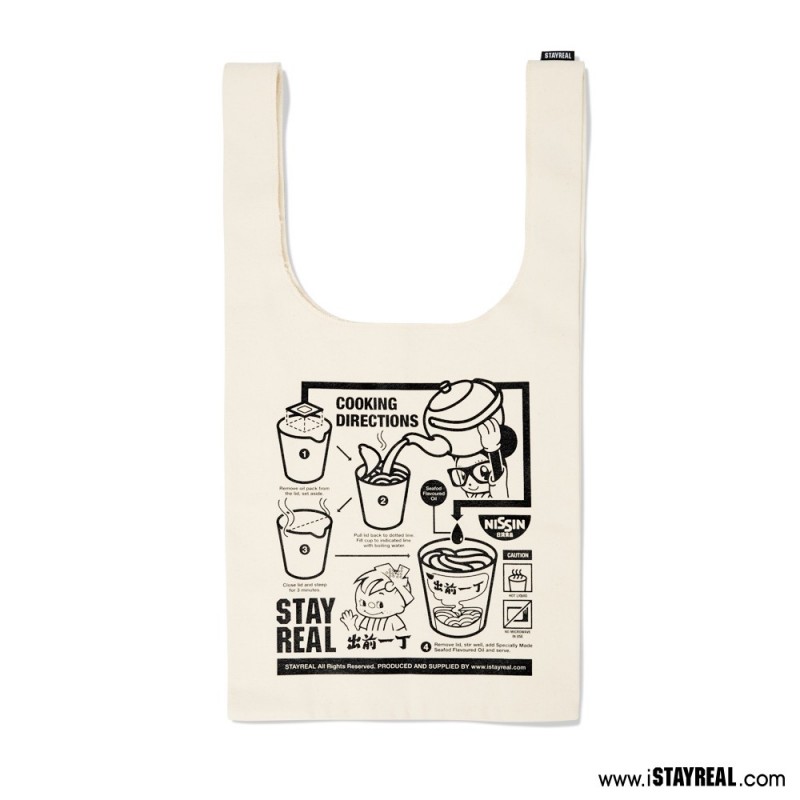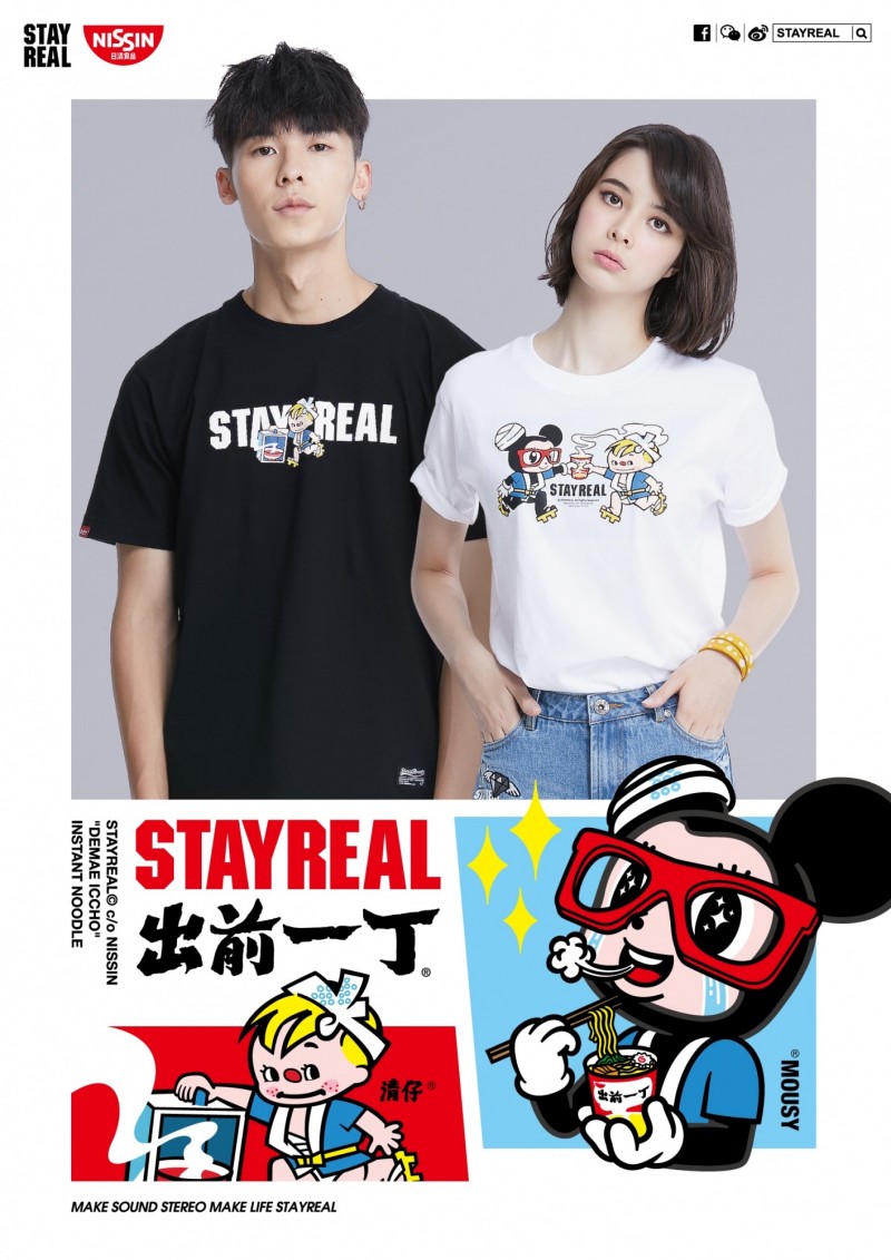 STAYREAL x出前一丁聯名系列以日式漫畫的設計風格,由出前一丁的美食速遞代表性人物清仔,把握三分鐘的最佳賞味時間,將熱騰騰的拉麵送到美食觀察家「小鼠」面前,生動捕捉享受美食的瞬間,展現來自日本的道地美味,這次的聯名系列共有四款圖騰T-shirt、小鼠印花的聯名杯麵,帆布包、泡麵碗以及環保餐具等商品。