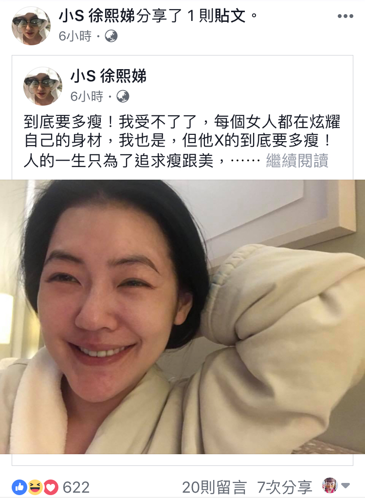 〔記者蕭宇涵/台北報導〕小S常在臉書分享日常生活,也有幾次喝醉錄製影片訴說真心話,不過她曾對一直被懷疑喝醉表示不滿,今凌晨1點多她發文直呼:「我受不了了,每個女人都在炫耀自己的身材」,並坦言自己也是,更飆粗口說:「他X的到底要多瘦!」被網友笑稱又喝醉了。