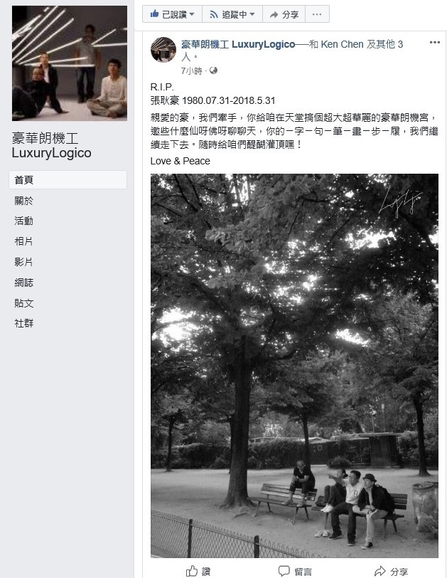 「豪華朗機工」臉書也於稍早前貼文紀念張耿豪:「R.I.P.張耿豪 1980.07.31-2018.5.31,親愛的豪,我們牽手,你給咱在天堂搞個超大超華麗的豪華朗機宮,邀些什麼仙呀佛呀聊聊天,你的一字一句一筆一畫一步一履,我們繼續走下去。隨時給咱們醍醐灌頂嘿!Love & Peace。」