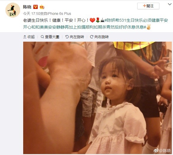 陳妍希與陳曉鮮少在社群網站放閃,但今天適逢陳妍希生日,陳曉難得在微博提到愛妻,嘴甜的說「老婆生日快樂!健康!平安!開心」,更不忘幫陳妍希祈禱新劇的拍攝順利結束,讓近期忙於工作的她能好好休息。陳曉還PO出了老婆的超萌童年照,以及一張疑似是「老公視角」的照片,只見陳妍希坐在窗台雙手扶著兒子,並露出寵溺笑容,穿著短裙的她露出一雙修長美腿,溫馨畫面讓粉絲直呼「閃到爆炸」、「這狗糧我服」。